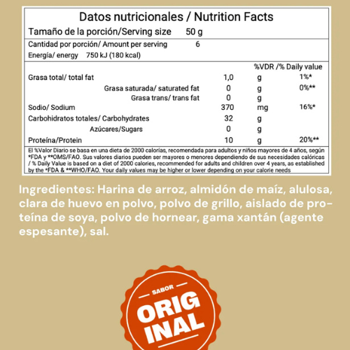 Ingredientes: Harina de arroz, almidón de maíz, alulosa, clara de huevo en polvo, polvo de grillo, aislado de proteína de soya, polvo de hornear, goma xantán (agente espesante) y sal.